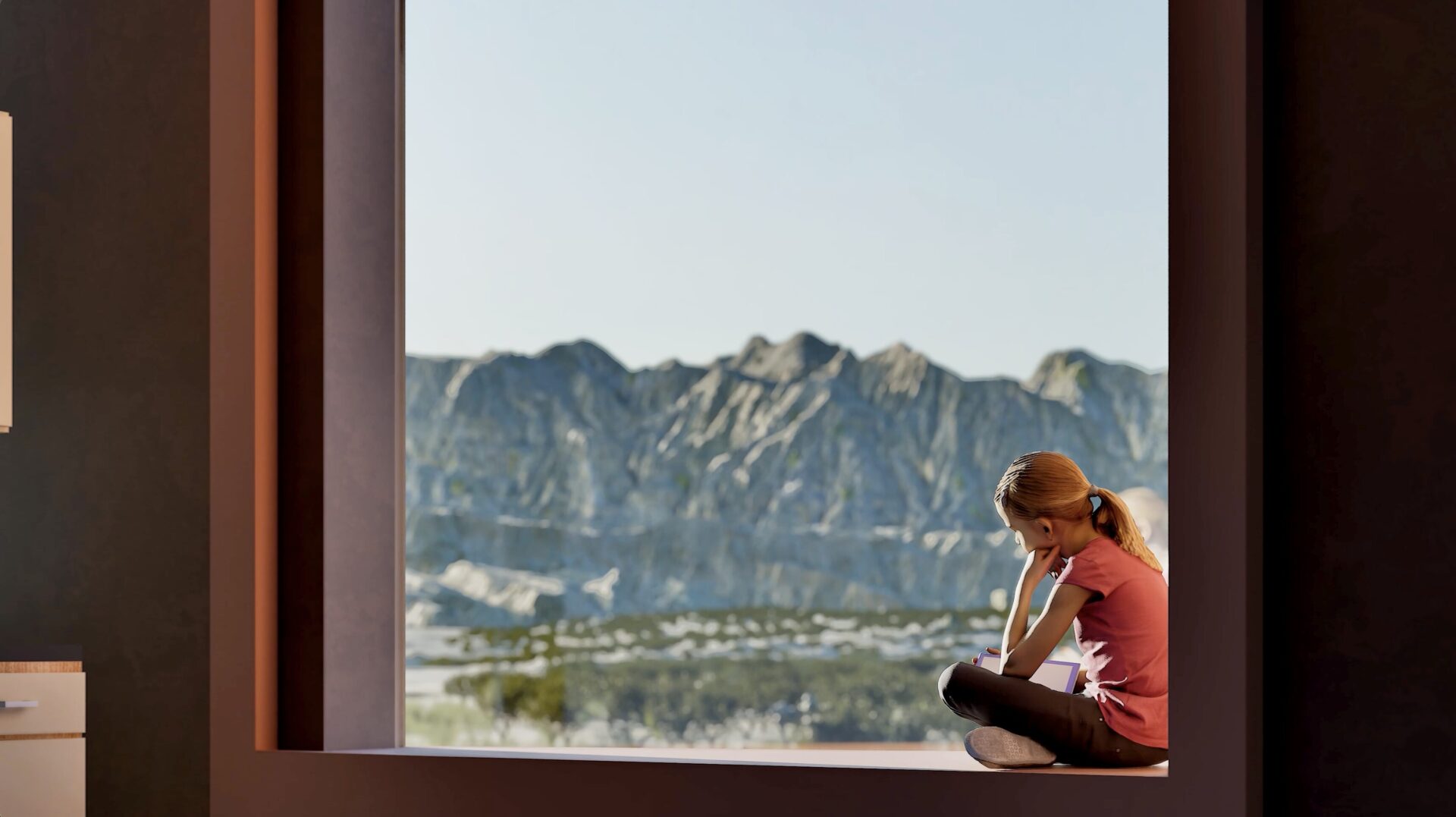 The school’s central corridor acts as “El Mirador,” a framed vista that captures a breathtaking view of the adjacent mountain range and embodies a message of vision, unity, and inspiration. Throughout the building, angled windows offer subtle glimpses of the mountains, creating smaller moments of discovery that connect students to the landscape as they move through the school.